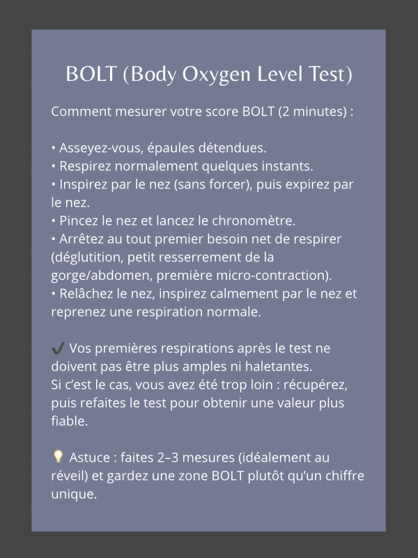 Pour l’évaluer concrètement, le test BOLT (Body Oxygen Level Test) offre une mesure simple et fiable de la tolérance au CO₂.