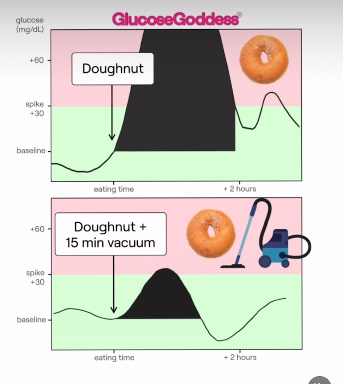 La solution : Après avoir mangé, faites une activité physique, même modérée. 10 à 15 minutes de marche ou de ménage semblent suffire – j’ai encore un peu de mal à y croire, je dois dire. Les muscles vont commencer à se vider de leurs réserves de glycogène, empêchant le pic. Quelques flexions sur les jambes (squats) sont particulièrement efficaces, car les quadriceps sont les plus gros muscles du corps et donc de grands consommateurs de glucose.