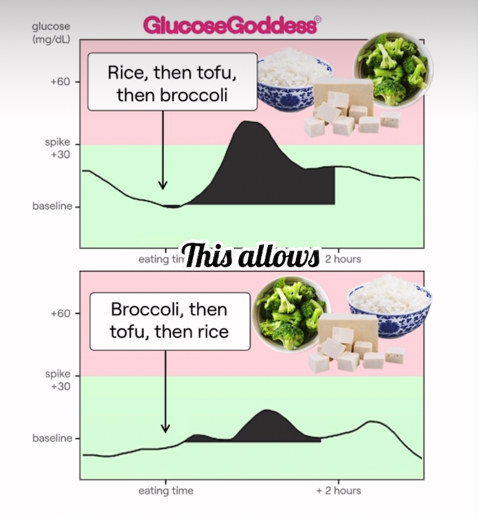 Manger un bol de riz en premier, c'est comme verser de l'eau dans un entonnoir vide : tout passe d'un coup. Manger des brocolis et du tofu avant ce même riz, c'est comme mettre un filtre à café dans l'entonnoir avant de verser l'eau : le flux est lent et contrôlé.